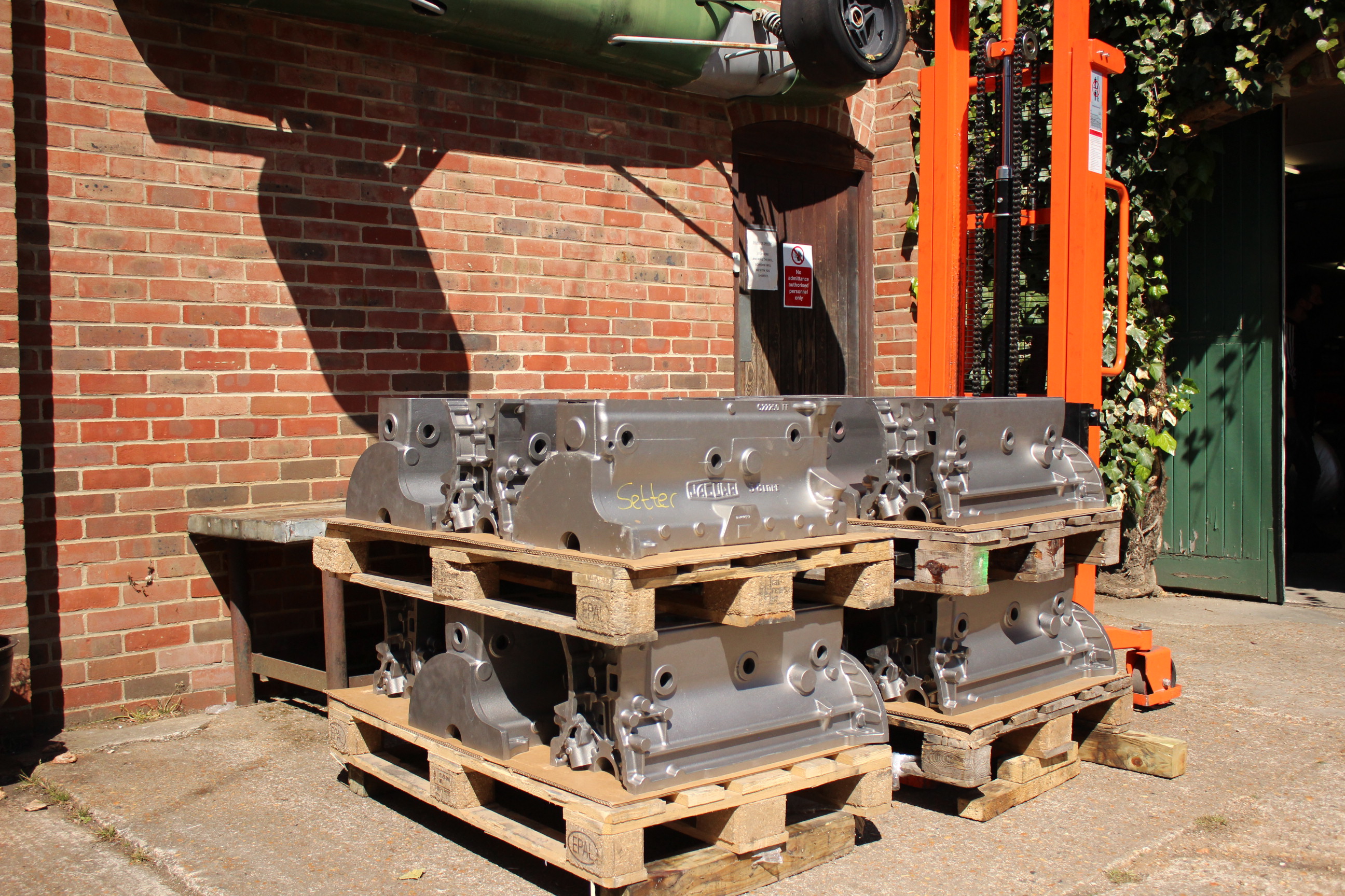 A few pallet loads of Jaguar E-Type cylinder block castings are sitting in the sun waiting to be unloaded. These, freshly delivered from the foundry will soon be sitting on our CNC mills and finely crafted into finished pieces.